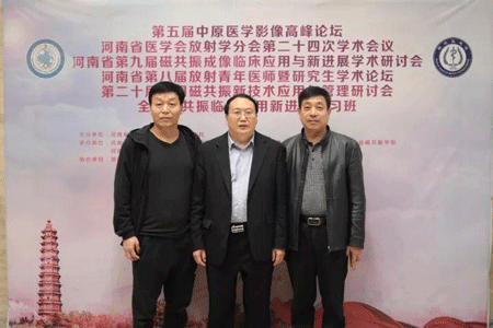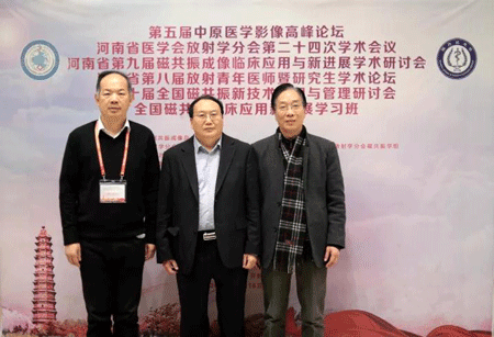 河南省医学会放射学分会执行主席程敬亮教授(中)、河南省医学会放射学分会秘书长黎海亮教授(左一)和梅清科技销售总监张锡雄先生(右一)